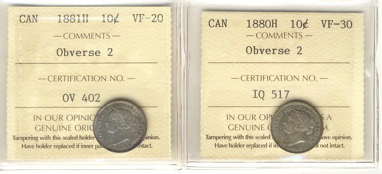 1880H 10¢ Obv 2 VF30 & 1881H Obv 2 VF20. Lot of 2 ICCS graded coins.
