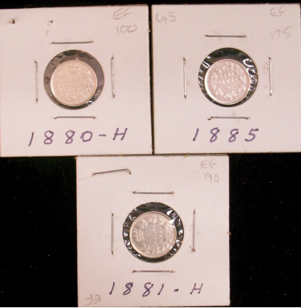 1880H, 1881H & 1885 5¢. Lot of 3 coins VF to EF.
