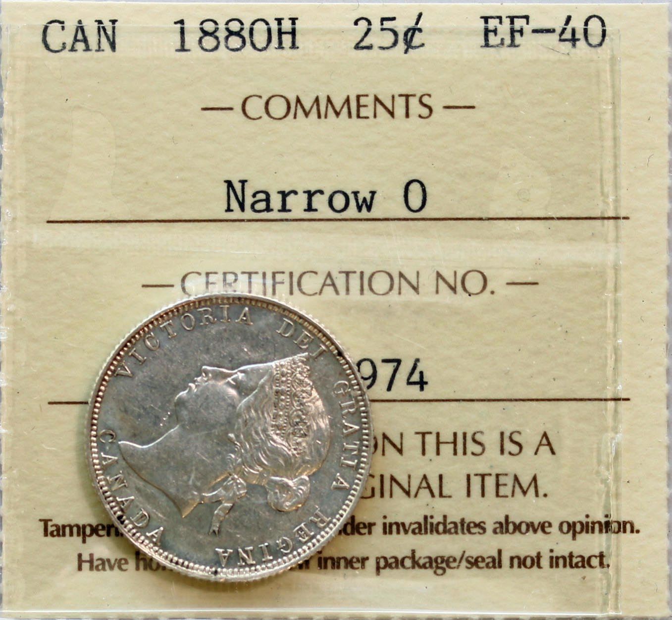 1880H 25¢ "Narrow O" ICCS Extra Fine-40. Bright key issue with some lustre.
