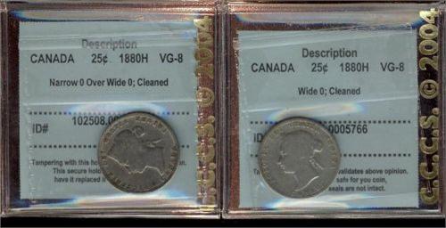 1880H 25¢ Wd 0 and Nar / Wd 0, both CCCS VG8 Cleaned.