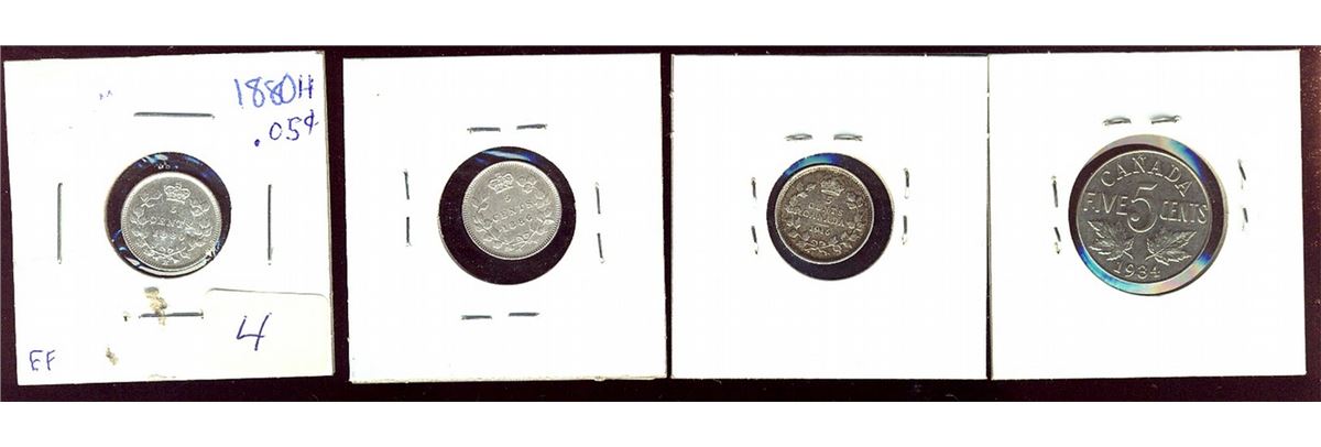 1880H 5¢ EF with dig, 1886 Lg 6 VF, 1916 EF & 1934 EF. Nice lot of 4 pcs.