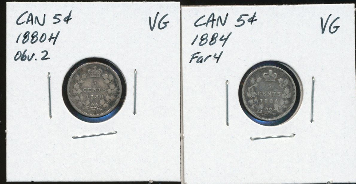 1880H 5¢ Obv 2 & 1884 Fr both VG. Lot of 2 coins both VG with 1880H showing minor rim issue.