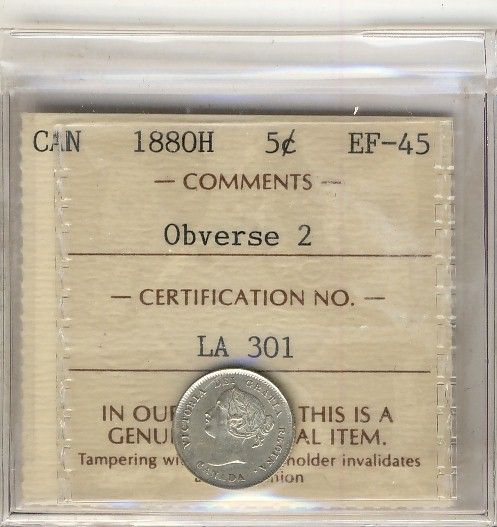 1880H 5¢ Obv 2 ICCS EF45. Better Obverse type.