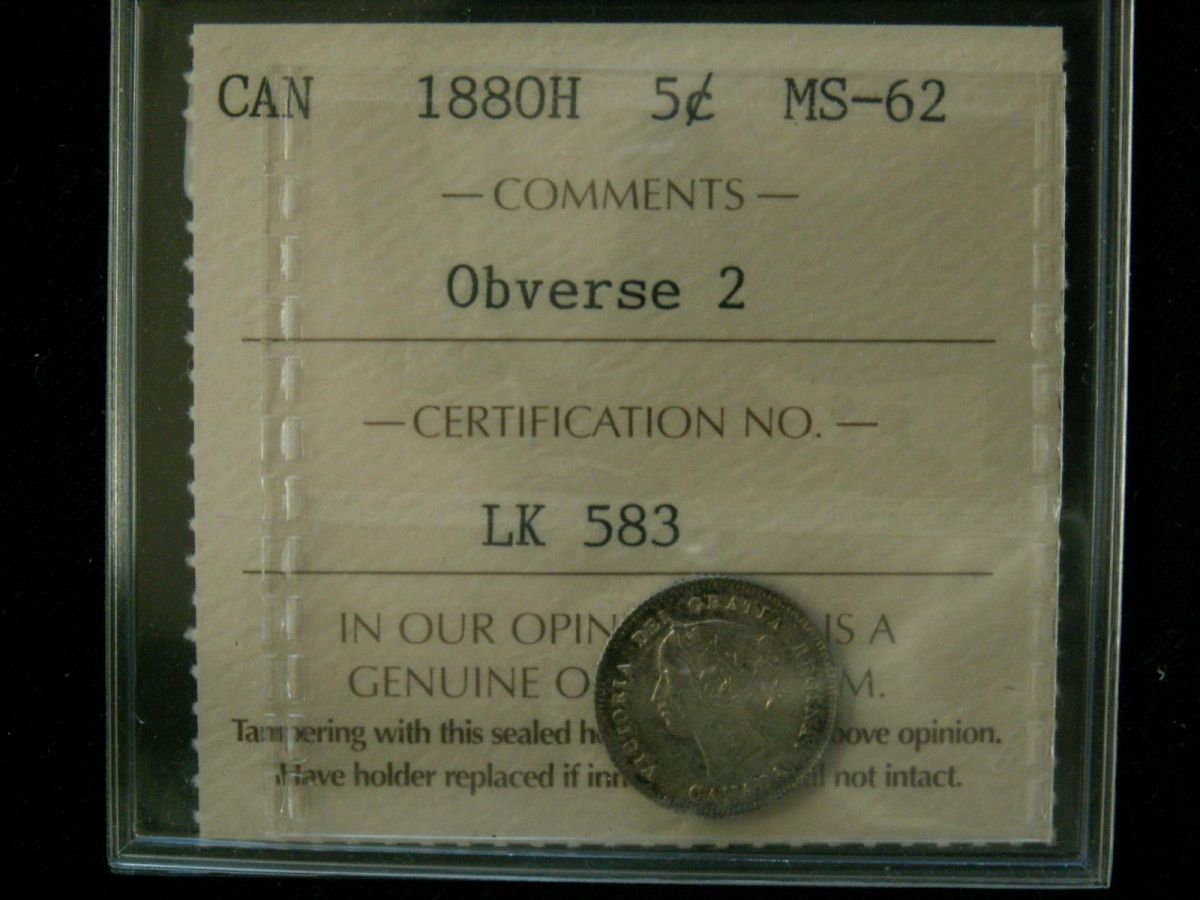 1880H 5¢ Obv 2 ICCS MS62. Rare obverse and unlisted in this grade.