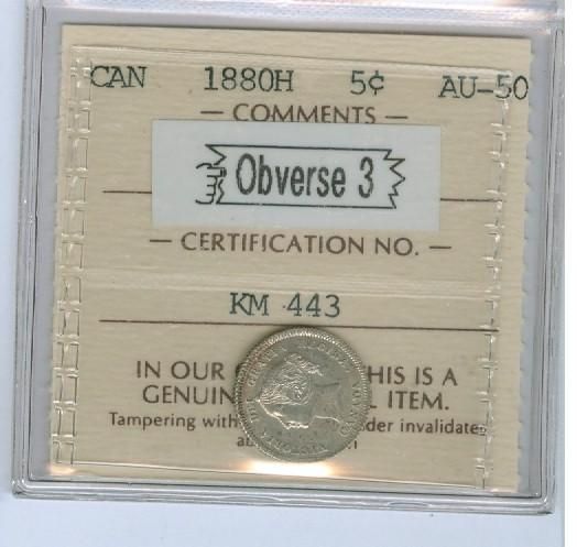 1880H 5¢ Obv 3 ICCS AU50. Light scattered shades.