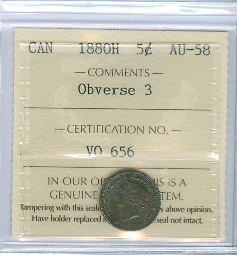 1880H 5¢ Obv. 3 ICCS AU58. Darkly toned example.