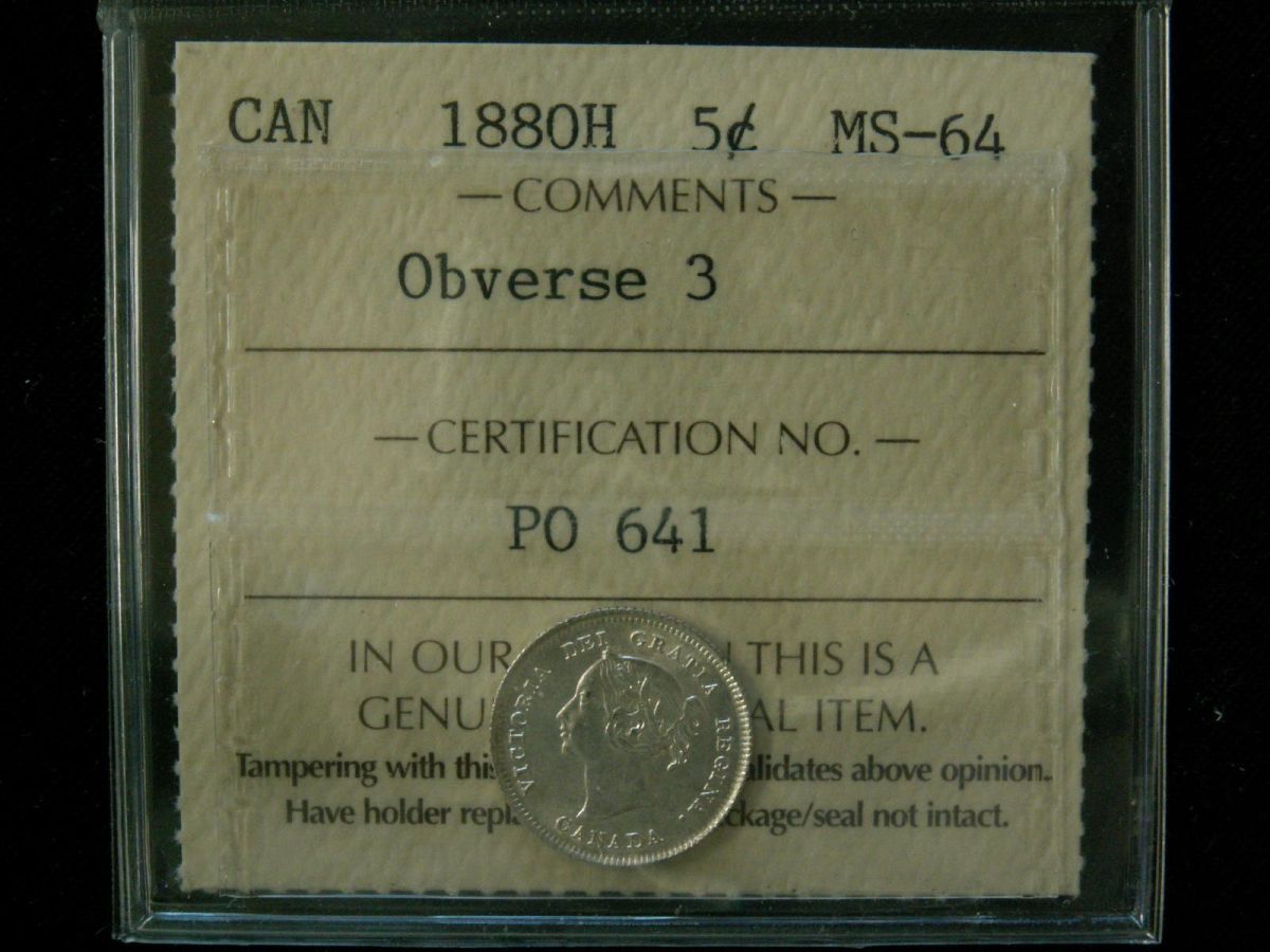 1880H 5¢ Obv 3 ICCS MS64. Brilliant and well struck issue. Only 5 examples finer.