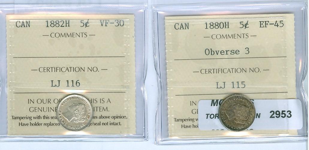 1880H. 5¢ Obv. port. #3. ICCS EF-45; 1882H. ICCS VF-30. Lot of two (2) coins. The first with medium toning and the last mostly brilliant.