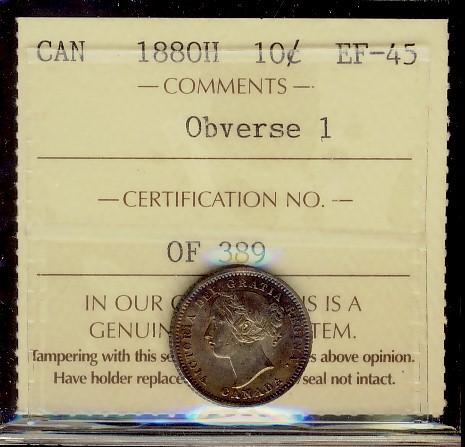 1880H Obv.1 10¢ ICCS EF45, choice with lovely toning.