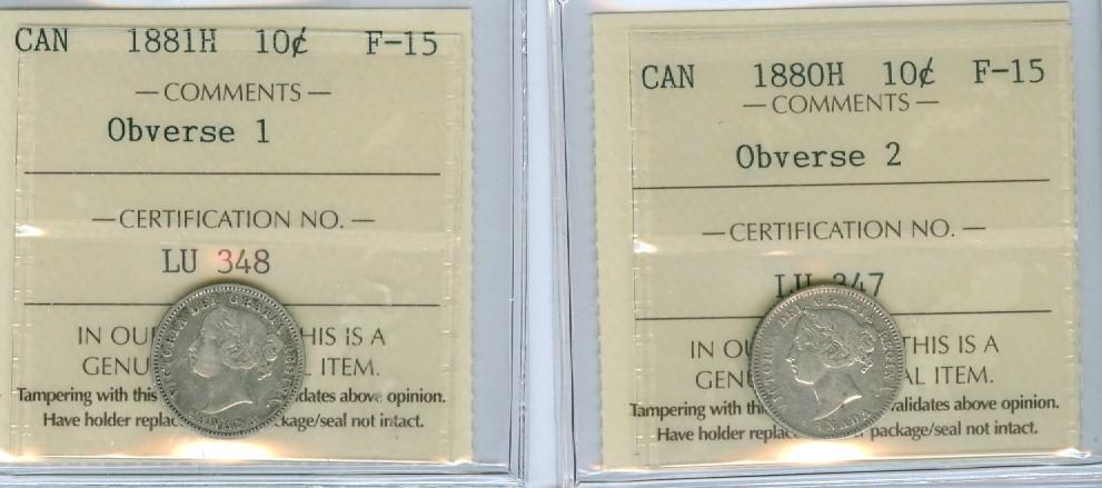 1880H Obv.2 and 1881H Obv.1 Lot of 2 ICCS graded 10¢ coins, both F15.