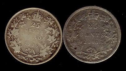 1880H " Wide O" & 1936 Dot 25¢. Lot of 2 coins both VG.