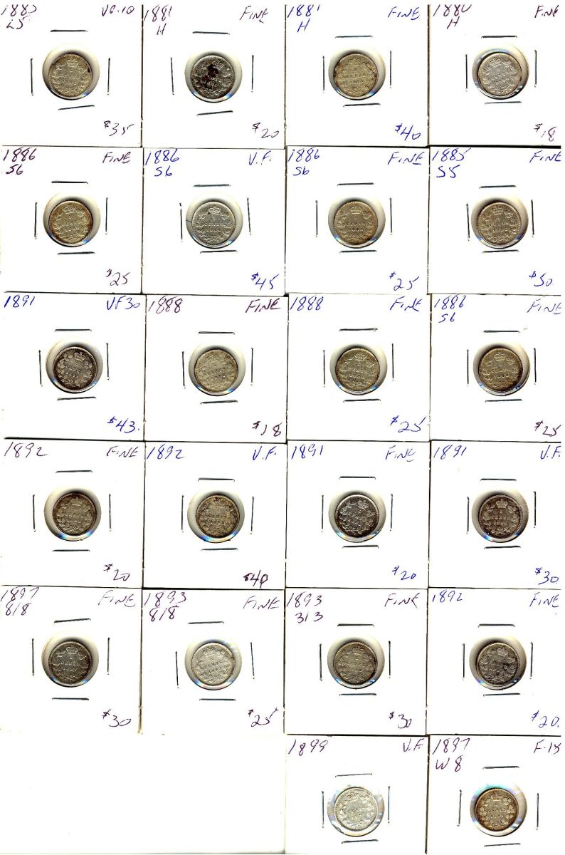1880H to 1899 5¢. Lot of 22 Vctorian pcs VG to F12. Includes 1880H, 1881H,(2), 1885(2), 1886(4), 1888(2), 1891(3), 18923), 1893(2), 1897(2) & 1899. Should be viewed.