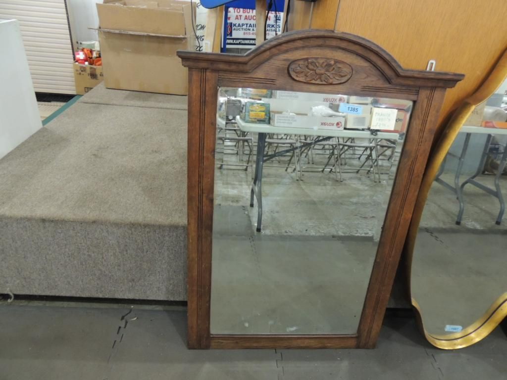 1880S FRANCE WOODEN FRAMED MIRROR CARVED WOODEN DETAIL ON TOP. AS SHOWN. SEE PHOTO FOR MORE DETAILS.