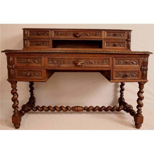 French Oak Hunting Desk with Barley Twist Legs. Ten drawers for lots of storage! Desk surface slides out for additional writing space. Wood separation on top and writing surface due to age and temperature fluctuations through the years. Some separation has old repair, however this does not take away from the beauty or utility of the piece. Please refer to photos or contact us for further information. At EuroLux, our customer's happiness is our top priority. For this reason, we go to great lengths to fully, honestly and accurately describe our pieces. As we hand-select all of our pieces personally, we only buy high-quality items. However, please keep in mind that there is no such thing as a new antique or vintage item, and normal wear associated with these items is to be expected.