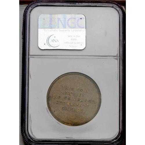 <B>(1880s) S.D. Childs & Co., R-Il-Ch-16, AU55 NGC.</B></I> Gilt brass. Childs were die sinkers and issued a number of tokens for various merchants mainly in the Chicago area. Predominantly chocolate-brown with glimpses of gold color where gilt remains. Unimportant carbon is mostly relegated to the borders.<BR><I>From The Troy Wiseman Collection.</B></I>