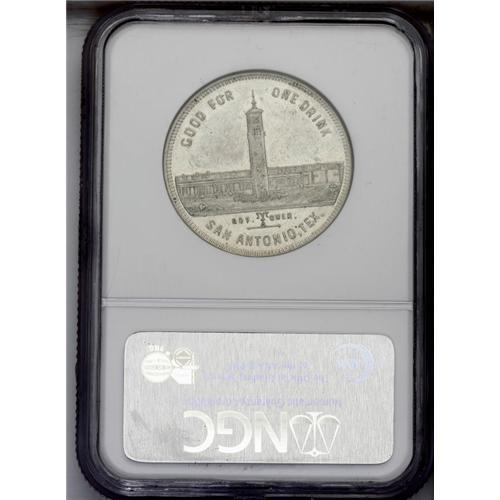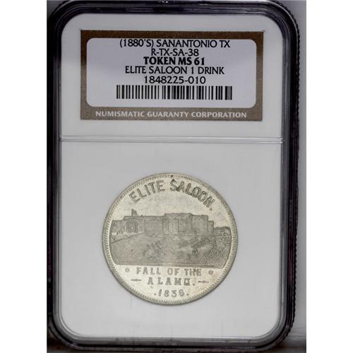 <B>(1880s) San Antonio Texas Elite Saloon Token, Tx-SA 38, MS61 NGC.</B></I> German silver, 31mm, plain edge. Obverse: soldiers attacking the Alamo at center, Elite Saloon, above. Fall Of The / Alamo / 1836, below. Reverse: building with tall tower at center, Good For One Drink, above. Gov. Tower / San Antonio, Tex. below. Rulau states that this is regarded as one of the most beautiful of the Texas pictorial tokens produced. The army of Santa Ana is clearly visible on the obverse. Light wear on both sides; a few striations on obverse; still very reflective and mirrorlike.