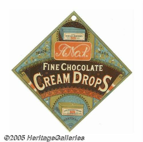 <B>1880s Triangular Chocolate Drops Sign</B></I> This sign pictures the standard product box for this candy maker. Holed as made at the top, the sign was to be hung from a ceiling fan string or on the wall. An eye catching Victorian graphic on thin cardboard with very bright color, this sign is 6 1/4" square. The condition is super even for the most discriminating buyer. Lot:252