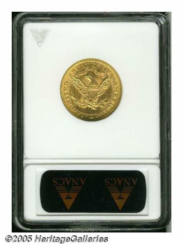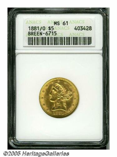 <B>1881/0<$5> MS61 ANACS.</B></I> FS-005, Breen-6715. The date is repunched northeast with a noticeable spread, and remnants of the underdigit 0 bookend the final 1 in the date. A pinscratch is near the U in UNITED, otherwise this lustrous and crisply struck example is impressive for the grade.<BR><I>From The Dr. Theodore Almquist Collection.</B></I>
