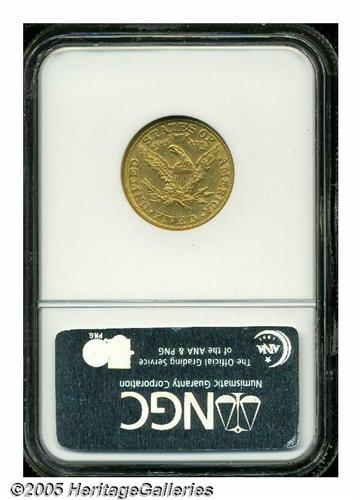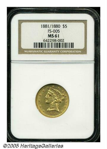<B>1881/0<$5> MS61 NGC.</B></I> FS-005, Breen-6715. Fivaz and Stanton note that the "entire date has been repunched [on examples of this variety], with the first 1 doubled at the base, the two 8s doubled to the south, and the last 1 punched over [a] 0, with the remnants visible on both sides of the 1." Peach-gold surfaces display luster in the areas around, and within the recesses of, the motifs. The design elements are well impressed. A few small marks are noted on Liberty's cheek and neck, and in the fields of both sides. Population: 13 in 61, 24 finer (4/05).