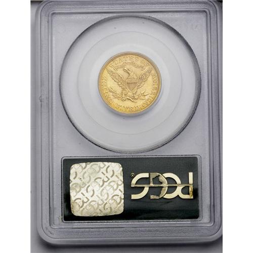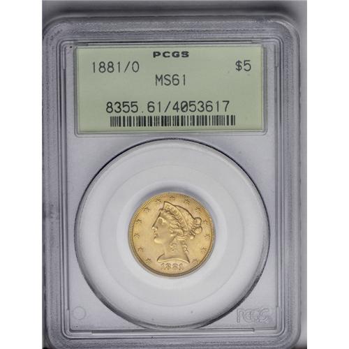 <B>1881/0<$5> MS61 PCGS.</B></I> FS-005. Traces of an earlier entered 1880 logotype are noticeable, particularly above the right foot of the final 1 in the date. This well struck older holder example has good luster and no obtrusive marks. Population: 8 in 61, 20 finer (4/06).