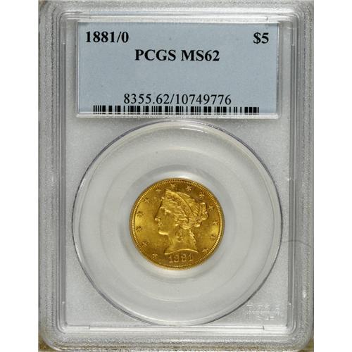 <B>1881/0 $5 MS62 PCGS.</B></I> FS-301, formerly FS-005. This satiny green-gold and honey representative is only lightly marked for the MS62 grade, and the strike is precise throughout. The 1881 is common, but the 1881/0 overdate is very scarce. Population: 11 in 62, 13 finer (1/07).<BR><BR><b>Shipping:</b> Coins & Currency (<a target="_blank" href="http://www.heritageauctions.com/common/shipping.php">view shipping information</a>)