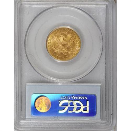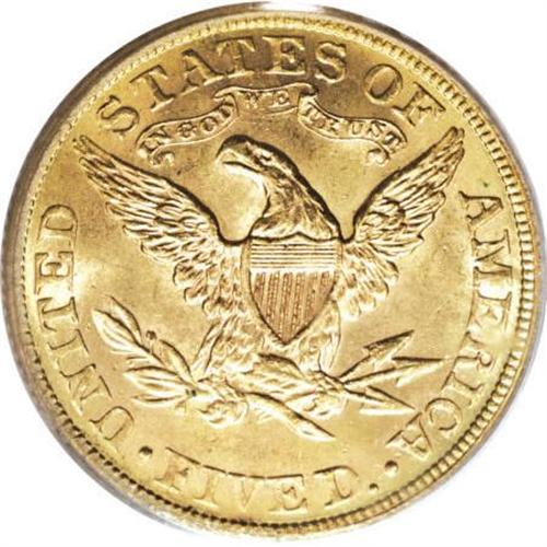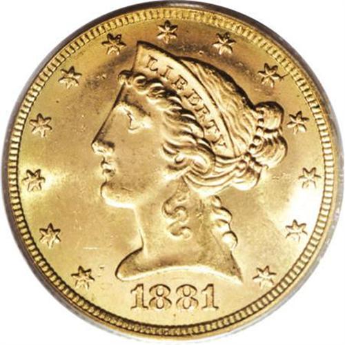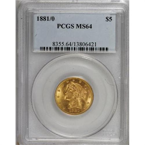 <B>1881/0 $5 MS64 PCGS.</B></I> FS-301, formerly FS-005. The remnants of a 0 are visible on both sides of the last 1 in the date. Bill Fivaz and J.T. Stanton, in their fourth edition of the <I>Cherrypickers' Guide</B></I>, say of the issue: "The 1881 date is clearly punched over an 1880 date. From the appearance of the repunching, each date was part of a four-digit logo punch." Bright luster issues from the peach-gold surfaces of this near-Gem example, and an impressive strike leaves sharp definition on the design elements. The grade is limited by some light contact marks and luster grazes. Population: 2 in 64, 0 finer (8/07).<BR><BR><B>Coin Engraver:</B> Christian Gobrecht<BR><BR><b>Shipping:</b> Coins & Currency (<a target="_blank" href="http://www.heritageauctions.com/common/shipping.php">view shipping information</a>)