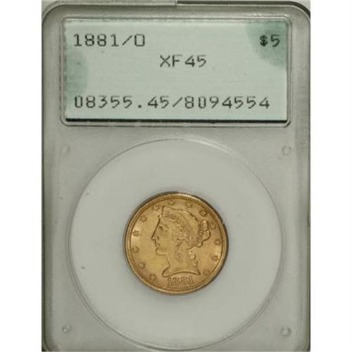 <B>1881/0 $5 XF45 PCGS.</B></I> PCGS Population (4/78). NGC Census: (1/84). Mintage: 5,708,802. Numismedia Wsl. Price for NGC/PCGS coin in XF45: $499. (#8355)<BR><BR><B>Coin Engraver:</B> Christian Gobrecht<BR><BR><b>Shipping:</b> Coins & Currency (<a target="_blank" href="http://www.heritageauctions.com/common/shipping.php">view shipping information</a>)