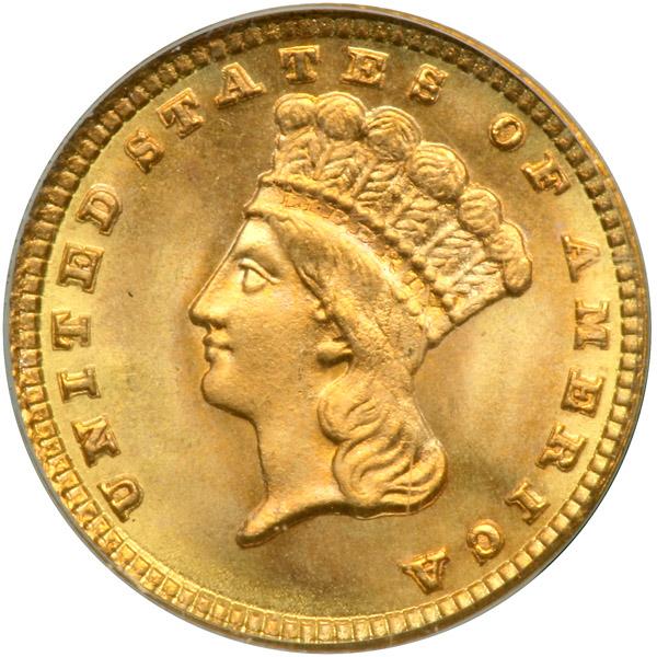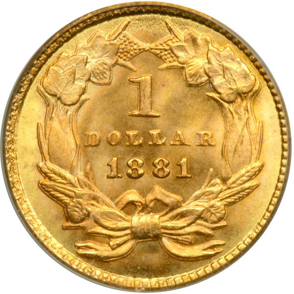 1881 $1 Gold Indian. PCGS graded MS-67 CAC Approved. A fabulous gem specimen with delicate golden and hints of olive toning. A Premium Quality coin that could be graded MS-68. In an old green label PCGS holder. Only 7,620 struck. Pop 83; 37 finer by a point (PCGS # 7582) .