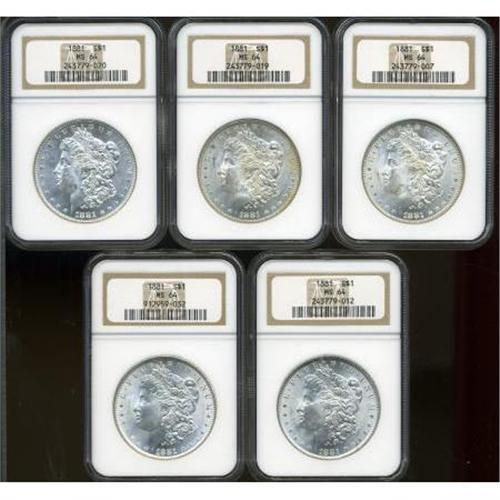 <B>(5)1881 $1 MS64 NGC. </B></I><BR><BR><B>Coin Engraver:</B> George T. Morgan<BR><BR><b>Shipping:</b> Coins & Currency (<a target="_blank" href="http://www.heritageauctions.com/common/shipping.php">view shipping information</a>)