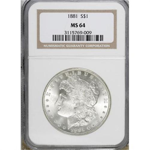 <B>1881 $1 MS64 NGC.</B></I> . NGC Census: (2920/577). PCGS Population (2815/754). Mintage: 9,163,975. Numismedia Wsl. Price for NGC/PCGS coin in MS64: $112. (#7124)<BR><BR><B>Coin Engraver:</B> George T. Morgan<BR><BR><b>Shipping:</b> Coins & Currency (<a target="_blank" href="http://www.heritageauctions.com/common/shipping.php">view shipping information</a>)