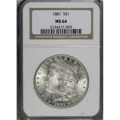 <B>1881 $1 MS64 NGC.</B></I> NGC Census: (2933/578). PCGS Population (2825/759). Mintage: 9,163,975. Numismedia Wsl. Price for NGC/PCGS coin in MS64: $112. (#7124)<BR><BR><B>Coin Engraver:</B> George T. Morgan<BR><BR><b>Shipping:</b> Coins & Currency (<a target="_blank" href="http://www.heritageauctions.com/common/shipping.php">view shipping information</a>)