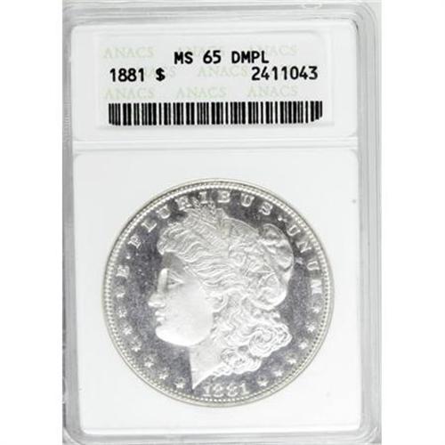 <B>1881 $1 MS65 Deep Mirror Prooflike ANACS.</B></I> David Bowers (2005) writes of the 1881 dollar that "Some dies are with prooflike surface and are in the distinct minority." Deep Mirror Prooflike coins are even more difficult to locate, especially in MS65 and finer grade, making the coin in this lot a very special offering. Well struck, mildly frosted devices appear to ride over the deep watery fields of this wonderful Gem Deep Mirror Prooflike specimen. A few small marks are consistent with the assigned grade.<BR><BR><b>Shipping:</b> Coins & Currency (<a target="_blank" href="http://www.heritageauctions.com/common/shipping.php">view shipping information</a>)