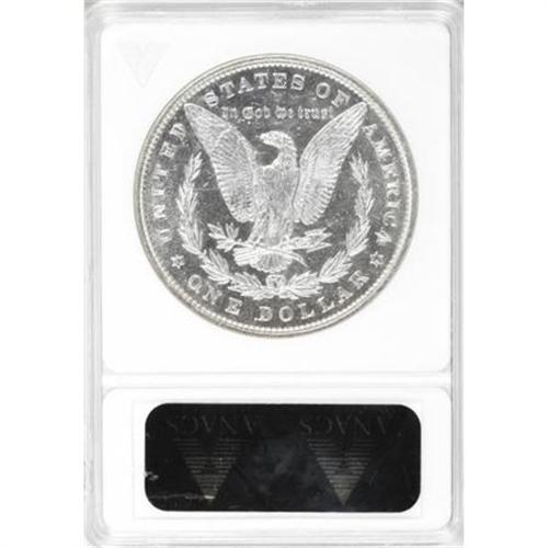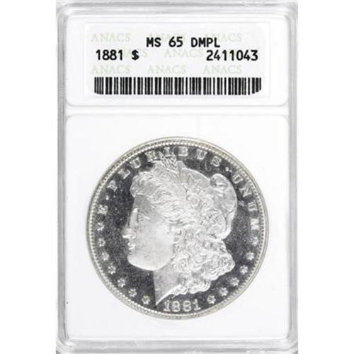 <B>1881 $1 MS65 Deep Mirror Prooflike ANACS.</B></I> The 1881 is a conditionally challenging Morgan dollar with Deep Mirrored fields and in MS65 condition. This is a nicely struck Gem with glassy, reflective fields and exemplary frost on the devices. Both sides demonstrate imposing cameo contrast. Nearly brilliant overall, there is just the slightest accent of golden color around the peripheries, and the devices are devoid of the usual abrasions and luster breaks.<BR><BR><b>Shipping:</b> Coins & Currency (<a target="_blank" href="http://www.heritageauctions.com/common/shipping.php">view shipping information</a>)