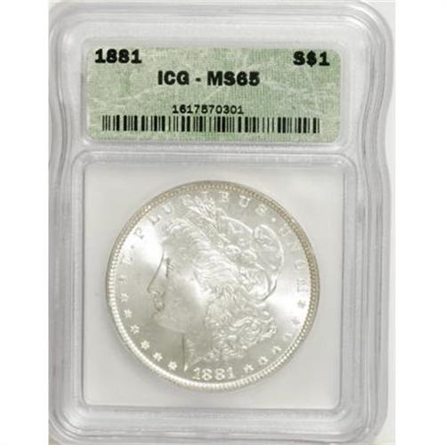 <B>1881 $1 MS65 ICG.</B></I> A decisively struck example that offers uncommonly strong luster for this early Philadelphia issue. Delicate sky-blue patina graces the carefully preserved fields.<BR><BR><B>Coin Engraver:</B> George T. Morgan<BR><BR><b>Shipping:</b> Coins & Currency (<a target="_blank" href="http://www.heritageauctions.com/common/shipping.php">view shipping information</a>)