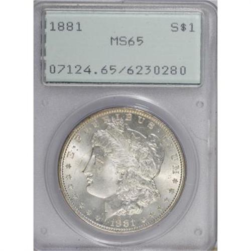 <B>1881 $1 MS65 PCGS.</B></I> Faint gold toning enriches this lustrous and meticulously struck Gem. Free from consequential contact, and a worthy addition to a quality collection. Housed in a first generation holder.<BR><BR><b>Shipping:</b> Coins & Currency (<a target="_blank" href="http://www.heritageauctions.com/common/shipping.php">view shipping information</a>)