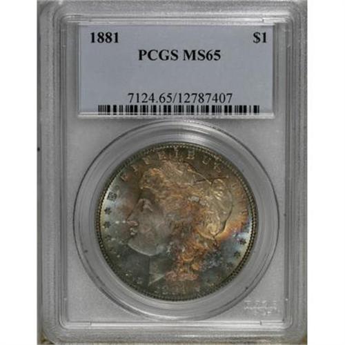 <B>1881 $1 MS65 PCGS.</B></I> This richly toned Gem offers powerful luster beneath subtle shadings. Elements of gold-orange, blue-green, and grape toning converge on each side. PCGS has graded 59 finer pieces (1/08).<BR><BR><B>Coin Engraver:</B> George T. Morgan<BR><BR><b>Shipping:</b> Coins & Currency (<a target="_blank" href="http://www.heritageauctions.com/common/shipping.php">view shipping information</a>)