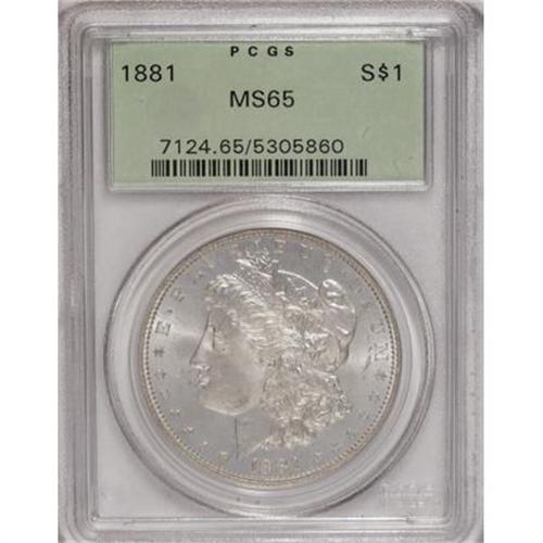 <B>1881 $1 MS65 PCGS.</B></I> A flashy and mildly prooflike Gem with a razor-sharp strike and a clean cheek. A lovely example of this early Philadelphia Mint issue, housed in a green label holder.<BR><BR><B>Coin Engraver:</B> George T. Morgan<BR><BR><b>Shipping:</b> Coins & Currency (<a target="_blank" href="http://www.heritageauctions.com/common/shipping.php">view shipping information</a>)