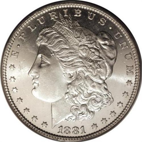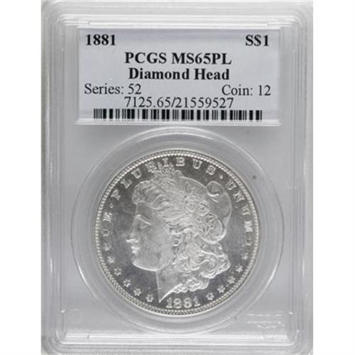 <B>1881 $1 MS65 Prooflike PCGS.</B></I> Ex: Diamond Head. A brilliant and beautifully preserved Gem. The obverse field is particularly unabraded. More than 9 million 1881 silver dollars were struck, and although normal business strikes are plentiful, prooflike pieces are very scarce, and prooflike Gems are incontestably rare. Population: 10 in 65 Prooflike, 0 finer (6/07).<BR><I>From the Diamond Head Registry Set of Prooflike Dollars.</B></I><BR><BR><B>Coin Engraver:</B> George T. Morgan<BR><BR><b>Shipping:</b> Coins & Currency (<a target="_blank" href="http://www.heritageauctions.com/common/shipping.php">view shipping information</a>\)