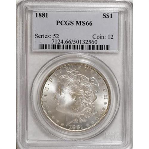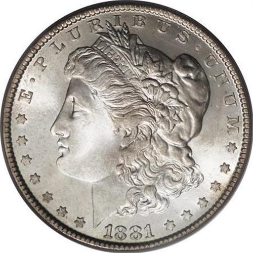 <B>1881 $1 MS66 PCGS.</B></I> Shimmering luster is seen on both sides of this Premium Gem that features only a bit of tan toning. The strike, while adequate, is not entirely full and fails to fully define the central portions of the obverse and reverse. David Bowers (2005) writes of the 1881 dollar, with a generous mintage of 9,163,000 business strikes: "Sharply struck, lustrous coins with superb eye appeal are hard to find and mount a challenge for the serious collector." The current Premium Gem, therefore, provides Morgan dollar enthusiasts with an infrequent opportunity. Population: 57 in 66, 2 finer (12/07).<BR><I>From The Motor City Collection.</B></I><BR><BR><B>Coin Engraver:</B> George T. Morgan<BR><BR><b>Shipping:</b> Coins & Currency (<a target="_blank" href="http://www.heritageauctions.com/common/shipping.php">view shipping information</a>)