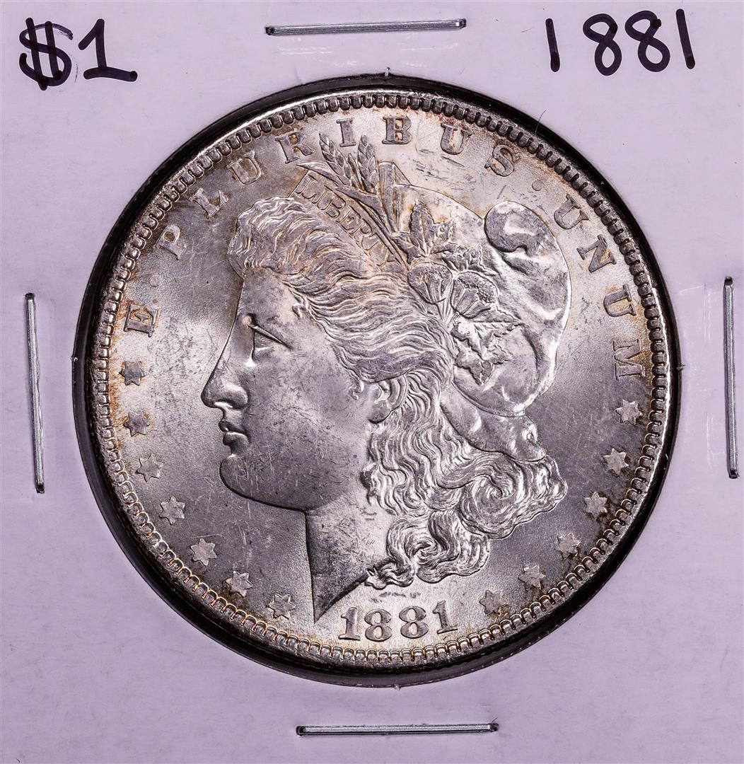 One 1881 $1 Morgan Silver Dollar Coin.