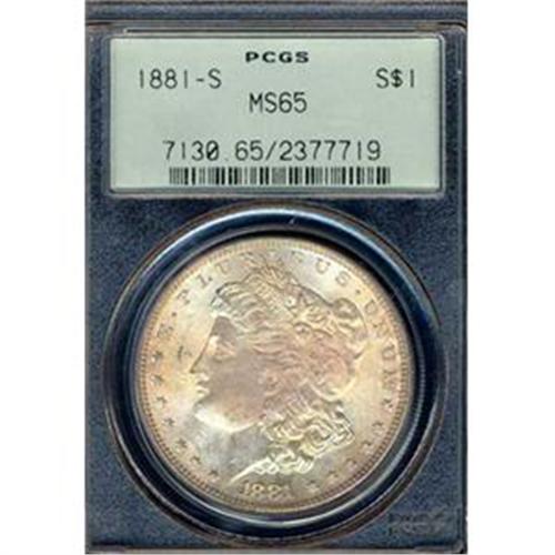 The surfaces are bright with moon-glow white luster underneath dusky golden to pinkish gold toning, and show none of the muting often seen on 1881-S dollars.