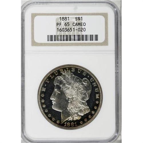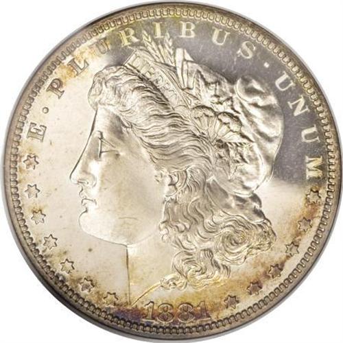 <B>1881 $1 PR65 Cameo NGC.</B></I> Whispers of cobalt-blue, purple, and golden-brown patina concentrate at the margins, yielding to light champagne-gold in the obverse center, and leaving the reverse central area untoned. A powerful strike emboldens the design elements. A few trivial handling marks preclude an even finer grade.<BR><BR><b>Shipping:</b> Coins & Currency (<a target="_blank" href="http://www.heritageauctions.com/common/shipping.php">view shipping information</a>)