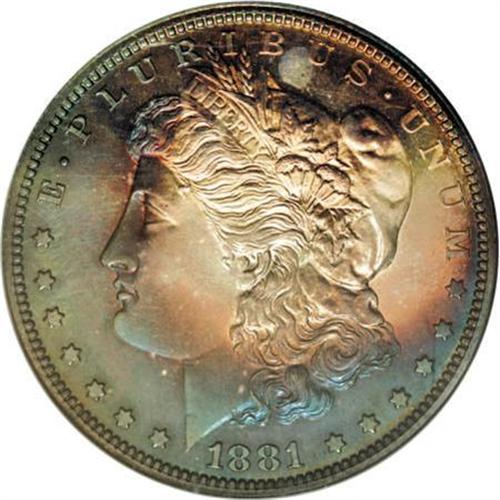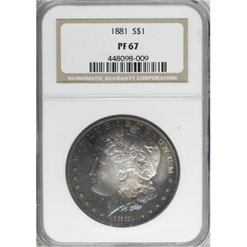 <B>1881 $1 PR67 NGC.</B></I> In his <I>The Official Red Book of Morgan Silver Dollars</B></I>, Q. David Bowers (2004) wrote about the proof dollars of 1881 and gave particular praise to two attributes: "Excellent strike and deep cameo contrast go together on most pieces." The gorgeous Superb Gem offered here displays the aforementioned bold detail, and a lightly toned region at the upper right obverse hints at the cameo effect that once appeared on that side. The rest of the specimen, however, now has rich violet, blue-green, orange, and jade patina. The fields are exquisitely preserved, and the overall visual appeal is grand. This delightful piece is of the finest survivors from a mintage of just 984 proofs. Census: 12 in 67, 5 finer (6/07).<BR><BR><B>Coin Engraver:</B> George T. Morgan<BR><BR><b>Shipping:</b> Coins & Currency (<a target="_blank" href="http://www.heritageauctions.com/common/shipping.php">view shipping information</a>\)