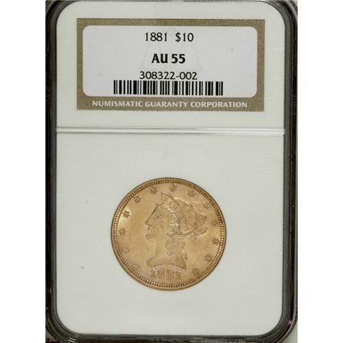 <B>1881 $10 AU55 NGC.</B></I> NGC Census: (70/7774). PCGS Population (134/3863). Mintage: 3,877,260. Numismedia Wsl. Price: $338. (#8691)<BR><BR><b>Shipping:</b> Coins & Currency (<a target="_blank" href="http://www.heritageauctions.com/common/shipping.php">view shipping information</a>)