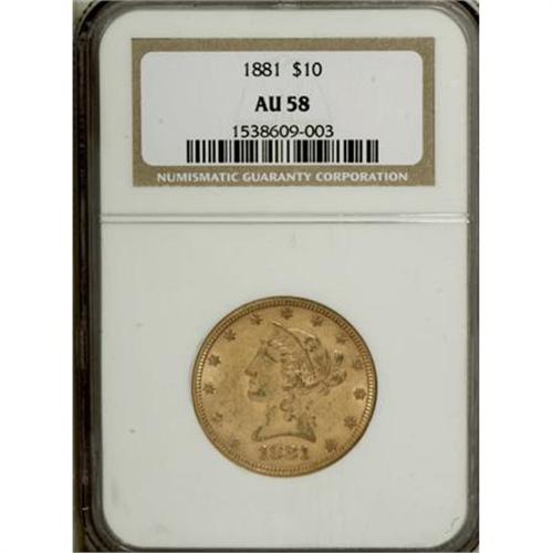 <B>1881 $10 AU58 NGC.</B></I> NGC Census: (277/7675). PCGS Population (354/3504). Mintage: 3,877,260. Numismedia Wsl. Price for NGC/PCGS coin in AU58: $360. (#8691)<BR><BR><B>Coin Engraver:</B> Christian Gobrecht<BR><BR><b>Shipping:</b> Coins & Currency (<a target="_blank" href="http://www.heritageauctions.com/common/shipping.php">view shipping information</a>\)