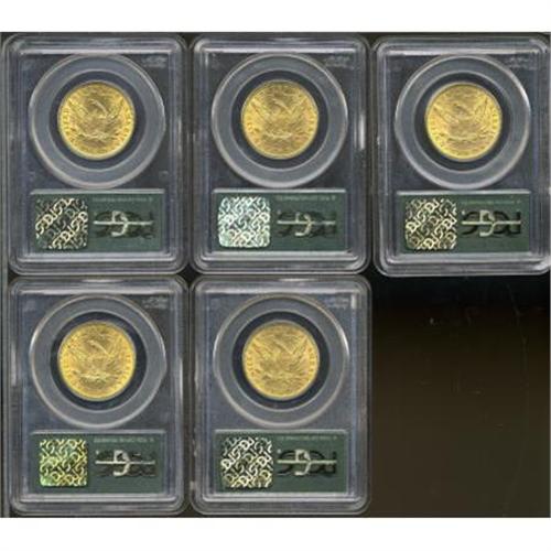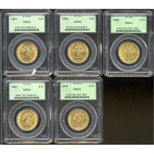 <B>1881 $10 MS62 PCGS; 1893 MS62 PCGS; (2)1895 MS62 PCGS; 1901 MS62 PCGS.</B></I><BR><BR><b>Shipping:</b> Coins & Currency (<a target="_blank" href="http://www.heritageauctions.com/common/shipping.php">view shipping information</a>)