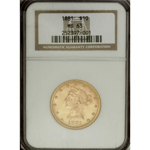 <B>1881 $10 MS63 NGC.</B></I> Select and well struck with lustrous wheat-gold surfaces accented in peach. Scattered marks on the devices and light abrasions in the obverse fields account for the grade.<BR><BR><b>Shipping:</b> Coin/Currency (<a target="_blank" href="http://www.heritageauctions.com/common/shipping.php">view shipping information</a>)