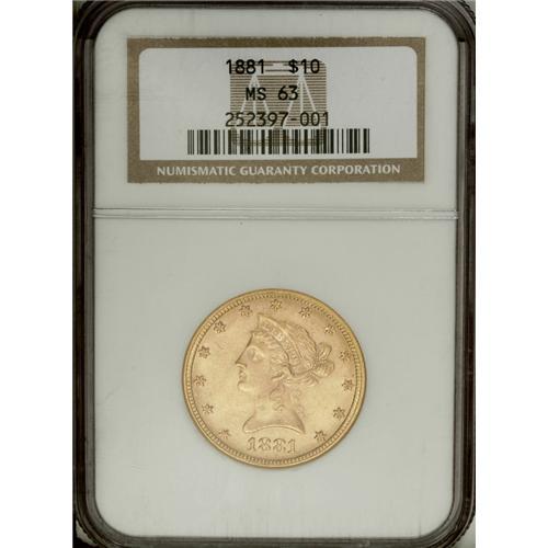 <B>1881 $10 MS63 NGC.</B></I> Select and well struck with wheat-gold surfaces accented in peach. The overall eye appeal is strong for the grade, with this coin's shimmering luster as the main contributor. An attractive common date ten dollar Liberty.<BR><BR><b>Shipping:</b> Coin/Currency (<a target="_blank" href="http://www.heritageauctions.com/common/shipping.php">view shipping information</a>)