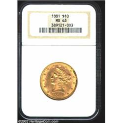 1881 $10 MS63 NGC. The second 8 in the date appears to be repunched with the upper loop. A well stru