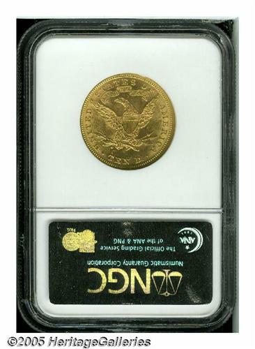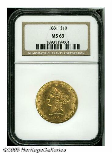 <B>1881<$10> MS63 NGC.</B></I> Yellow-gold patina reveals traces of light tan color, and overlies lustrous surfaces that reveal some scattered marks that are consistent with the grade. The design elements are well impressed throughout. NGC and PCGS have seen 38 coins graded higher (5/05).
